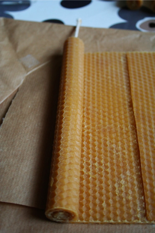 Et puis la suite est facile. Chauffez régulièrement la feuille de manière à ce que la cire colle à votre bougie et continuez de rouler la bougie doucement, en faisant attention sur les cotés que vous roulez droit et en faisant pression pour que la cire colle. A la fin de la feuille, chauffez bien la feuille, roulez, et appuyez bien pour “sceller” la bougie. Et tadam! 🙂