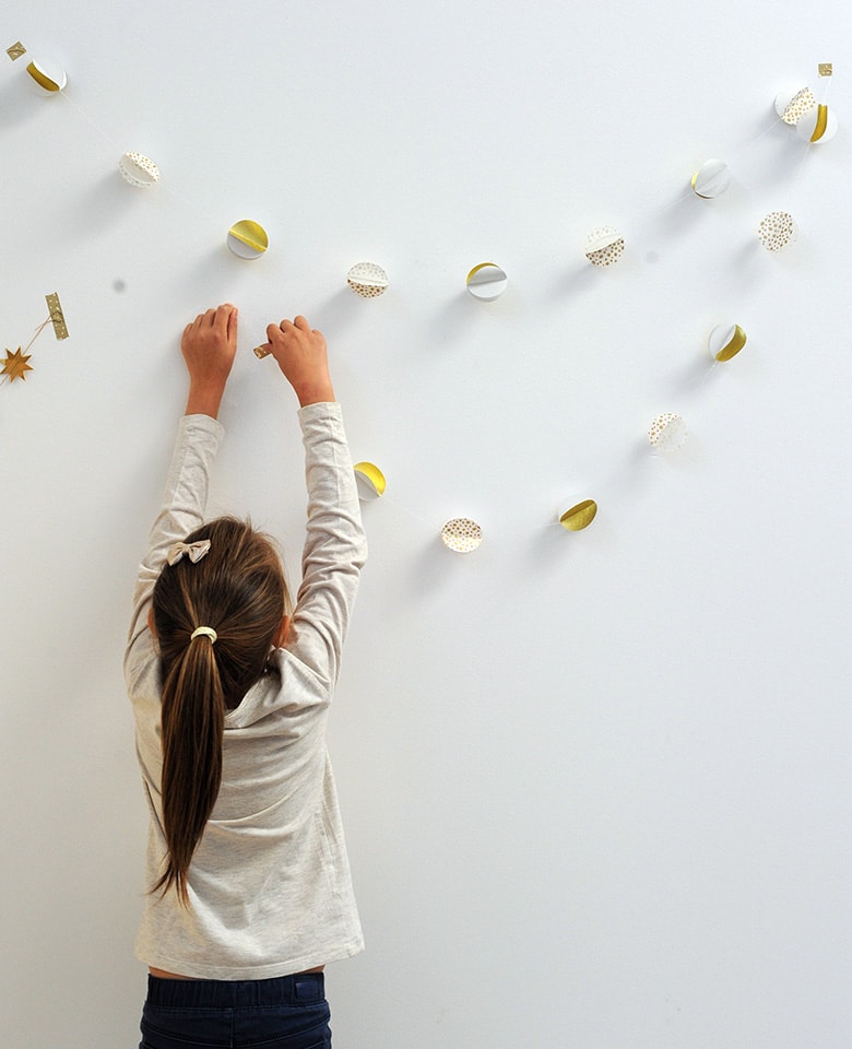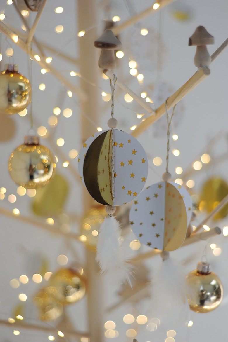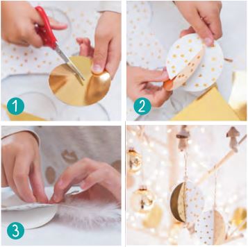 Fabriquez des boules de Noël en ronds de papier à personnaliser avec des perles, plumes, rubans colorés… Les possibilités sont illimitées ! Vous pouvez même utiliser vos réalisations pour créer une guirlande en cousant vos boules de papiers à la machine. Soyez créatifs !