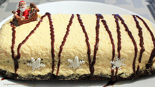 11. Sortez la glace à la vanille. Posez-la sur du film alimentaire. Faites un rouleau de la longueur d’un moule à cake et fermez hermétiquement. Remettez à prendre au congélateur.