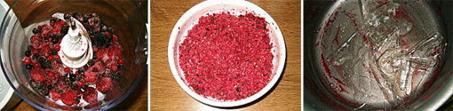2. Faire ramollir la gélatine dans un peu d’eau froide. Pendant ce temps, hacher les fruits (si ils sont encore congelés, cela ne pose pas de problème) et les faire chauffer quelques instants dans un poêlon afin d’y diluer la gélatine.