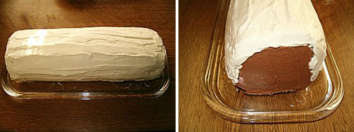 7. Battre le reste de crème en chantilly et recouvrir la bûche. Prélever un peu de crème fraîche pour y mélanger du cacao et faire les bouts de la bûche ainsi que la traditionnelle “découpe” sur le dessus de la bûche. Vous pouvez faire des dessins à la fourchette ou tout simplement lisser maladroitement avec la spatule pour laisser des traces.