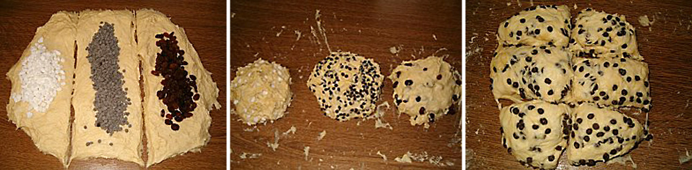 4. Étaler un peu la boule sur la table farinée et incorporer la garniture, j’ai divisé ma boule en 3 pour faire 3 garnitures différentes … couper ensuite la boule en 15 ou 18 petites parts.