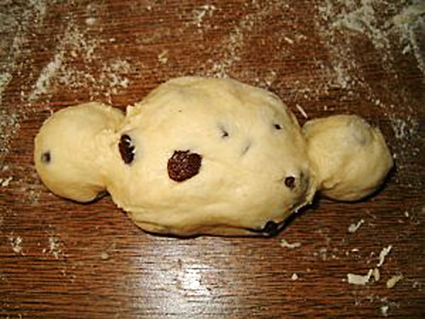 5. Former les cougnous en laissant une grosse boule au centre et 1 petite à chaque extrémité, farinez vos mains pour plus de facilité et je dois bien avouer qu’il faut certainement quelques années d’expérience pour arriver à en faire un cougnou parfait … ou formez tout simplement des boules.