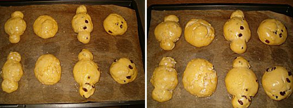 6. Déposer les cougnous sur 1 papier sulfurisé sur la plaque du four, battre le jaune d’oeuf avec la cuillère à soupe de lait et badigeonner chaque forme, laisser de nouveau reposer 1H dans une pièce chaude, ils vont encore gonfler un peu…