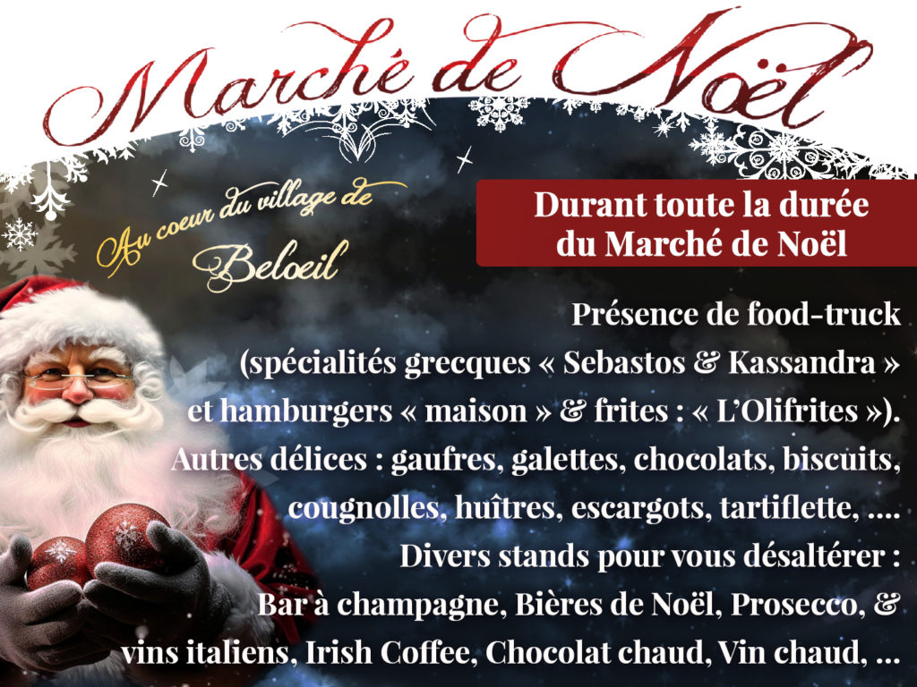 Au cœur de Beloeil, village illuminé de 40 chalets de Noël sur la “Liaison Paysagère”, accès via la rue de la Hunelle n°12, près de l’Office du tourisme.