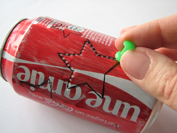 A l’aide d’un feutre indélébile, tracez le motif ou dessin de votre choix autour de la canette puis percez le long des dessins avec la punaise.