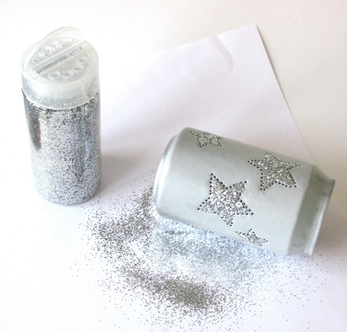Peignez votre canette. Après séchage, vous pouvez remplir vos motifs de colle puis arrosez de paillettes.