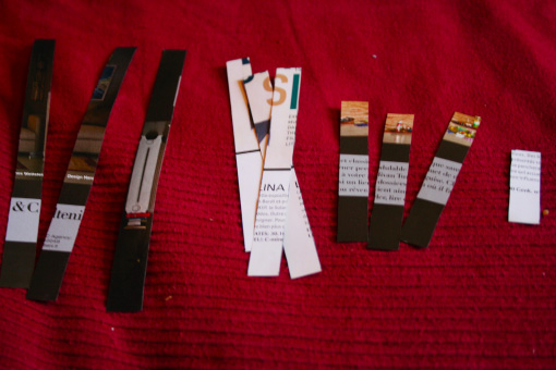Dans le magazine, tracez et découpez des bandes d’1,5 cm de largueur: 3 d’une longueur de 20cm, 3 de 15cm, 3 de 10cm et une de 5cm.