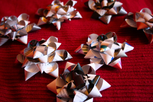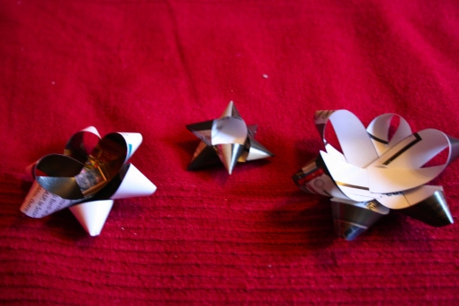 Assemblez-les en fonction de leur taille, empilez les « étoiles » de bandes et agrafez-les au centre. Faites une boucle avec la petite bande et collez la au milieu, de sorte à cacher l’agrafe.