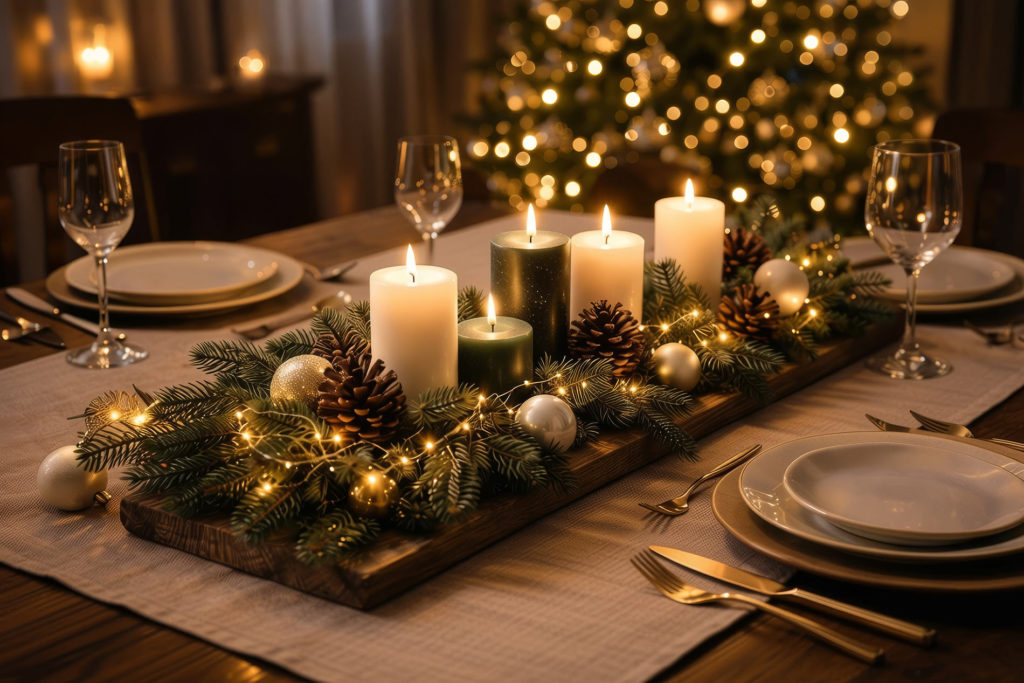 Créez un centre de table de Noël élégant et chaleureux grâce à un chemin de table DIY simple à réaliser.
